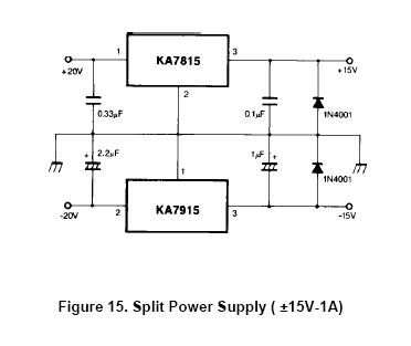 ở đây +Vs = 20V và -Vs = -20V, ổn áp ra là +/-15V