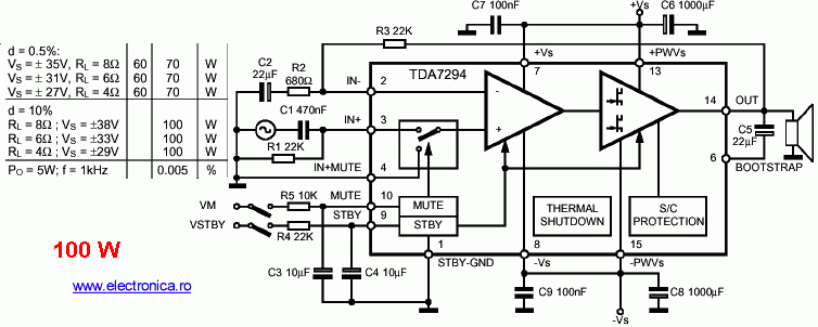Bạn hiểu gì về cái hình ?. hiểu đơn giản là nó cho công xuất 70-100w và dùng nguồn đôi từ 27-38v là tốt nhất ( có thể hơn xuống một ít ), các phần bên trong con chip ( trong hình chử nhật) các bạn bỏ qua, nó diển đạt cách sữ lý của nó thôi, mình chú ý bên ngoài, các ký hiệu điện trở và tụ điện , cuôn cảm nữa( cuộn dây đồng)